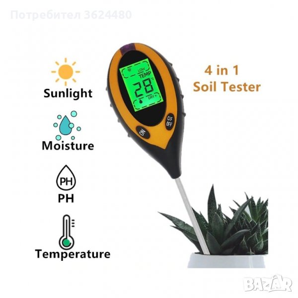 Портативен уред за измерване рН на почвата. Едновременно показва степента на почвената влага, слънчевата осветеност и почвената температура. Добре балансиран 4 в 1 инструмент за професионалисти и любители (влагомер за почва, рН-метър за почва, термометър за почва, светломер/луксометър).