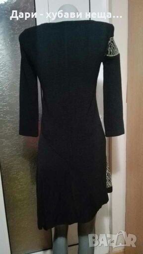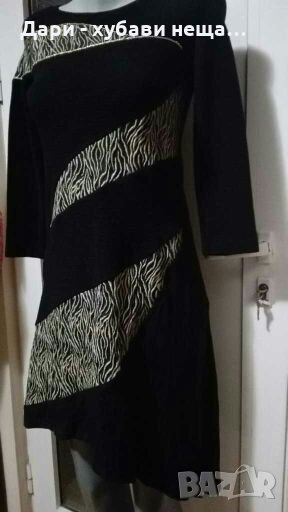 Красива елегантна рокля, с асиметрична пола.Материята е с еластичност и обхваща размери от XS, до М(38).ГО до 88см.При ръсът 170, късата част е малко над коляното, а дългата достига дължна след коляното.