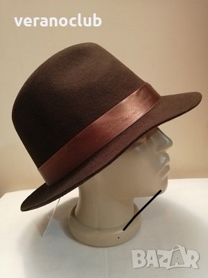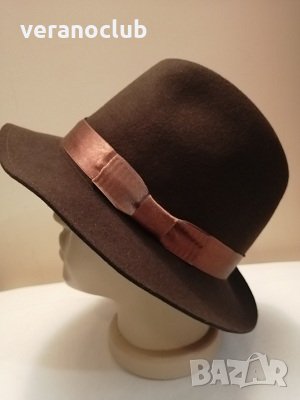 Дамска зимна шапка с права мека периферия, стил борсалино. Шапката е от естествен филц, който осигурява комфорт и топлина. Размерът е 58 см.