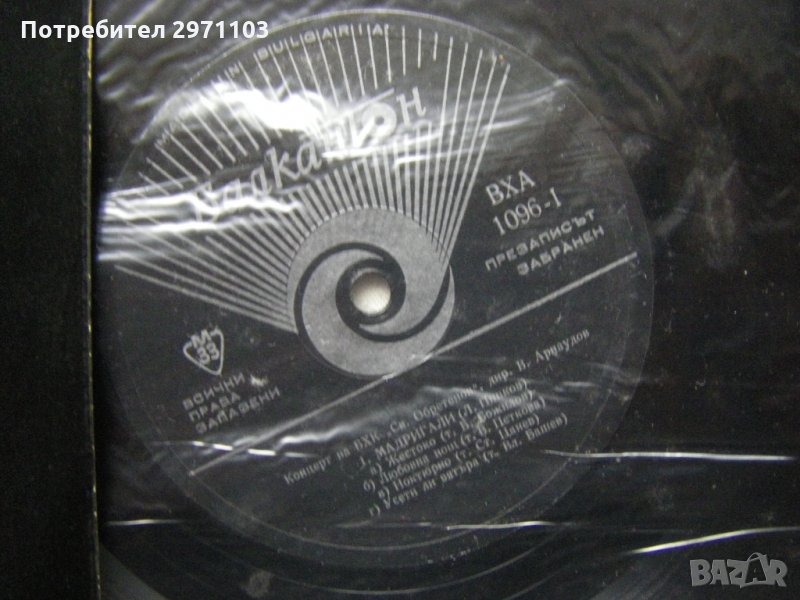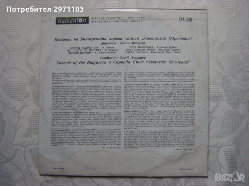 Грамофонна плоча - ВХА 1096 - Концерт на Българската хорова капела "Светослав Обретенов", диригент Васил Арнаудов