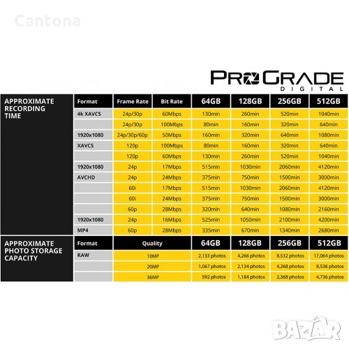 UHS-II SDXC карта с памет от ProGrade Digital предлага капацитет за съхранение на 128 GB на карта и се възползва от UHS-II шина за скорост на четене от 250 MB / сек и максимална скорост на запис от 130 MB / сек. Тази карта също е проектирана с рейтинг V60 Video Speed Class, който гарантира минимални скорости на запис от най -малко 60 MB/s, което позволява картата да се използва в DSLR, безогледални камери, видеокамери и цифрови кино камери за снимки и видео на 4K, UHD 4K, 3D, Full HD и MPEG-4 видео с висока скорост на предаване. Също така е подходящ за сурови снимки и бързи снимки.