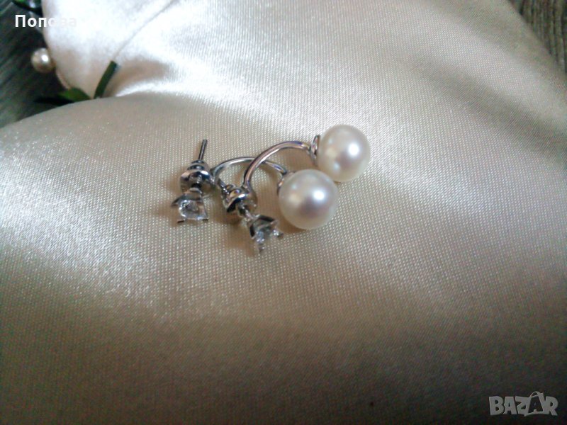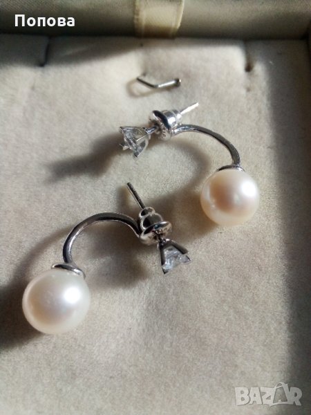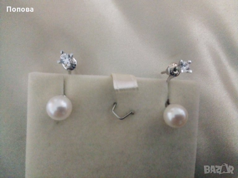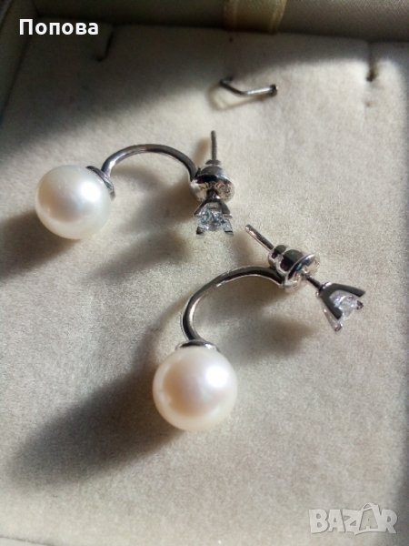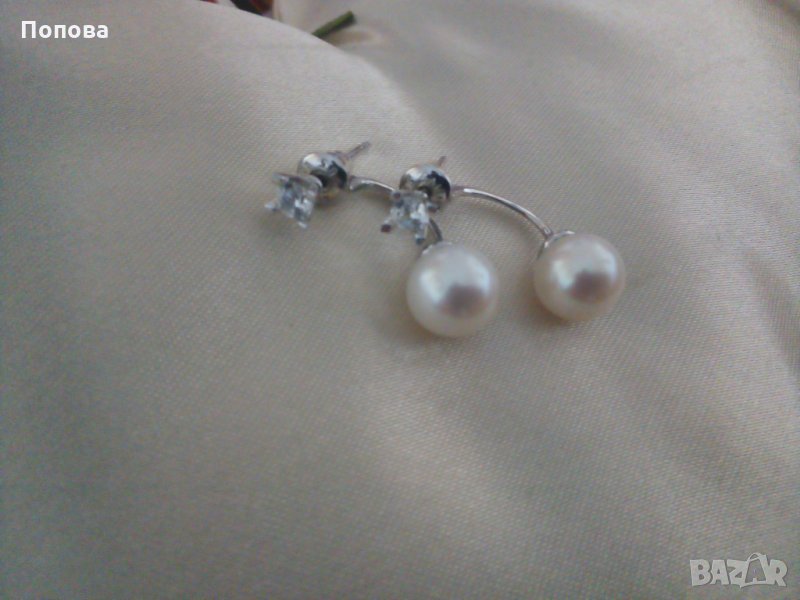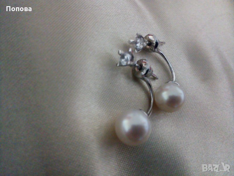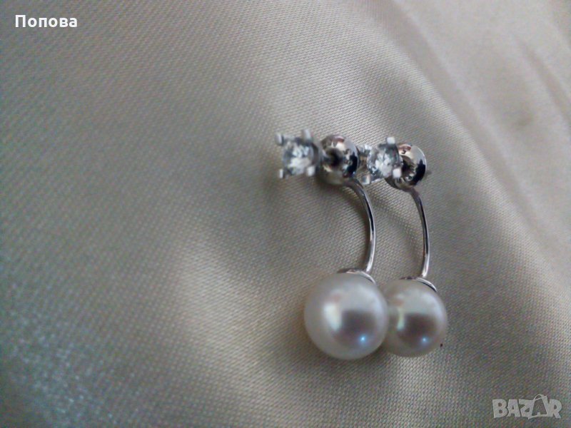 Слагани са 2-3 пъти,като нови.Елегантен модел бяло злато 14 карата 3,5 грама с бели кристали и естествени бледо кремави перли 8 мм. на Алтънбаш.Стоят много шик и частта с кристала може да се сменя с други обеци от същия тип. Дължина,8 см..