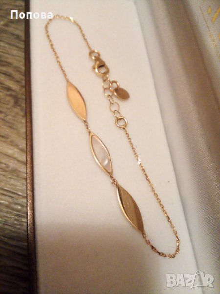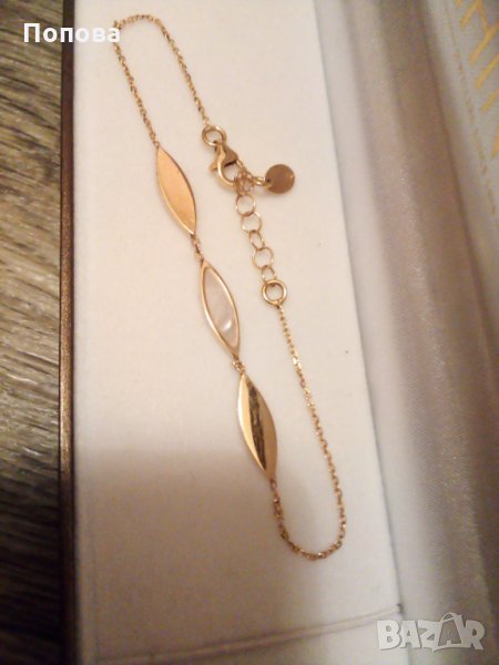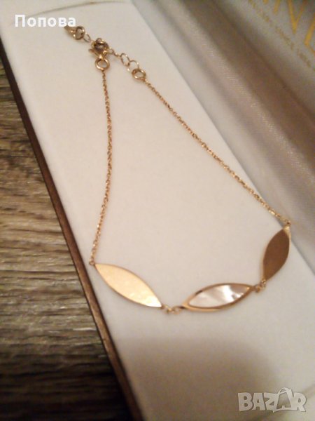 Гривната е от жълто злато 14 карата , 3,45 грама с естествен седеф .Със сертификат на фирмата.Дължината се регулира от 17,5. см до 20 см..Стои супер.