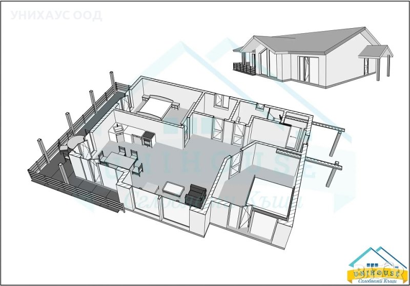 Къщата предоставя всички необходими стаи за малко семейство. Пространството е разпределено и зонирано за удобство и комфорт на своите ползватели.