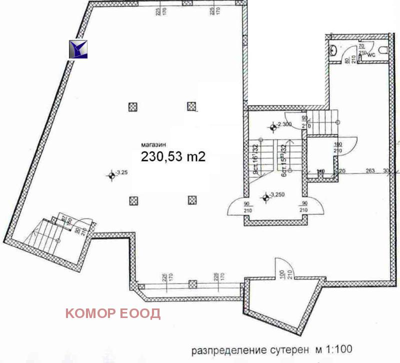 Височината на помещенията е 287см. Имотът е с разчупено вътрешно разпределение основната площ е 200 кв.м., приемна и три работни помещения, кухненски бокс и тоалетна. Минималната широчина на помещението /пасаж/ е 145 см. Имотът разполага с инсталирано локално газифицирано парно. Централно и отделно (комбинирано) за всяко помещение. Разполага и с централна аспиративна система и климатична инсталация.