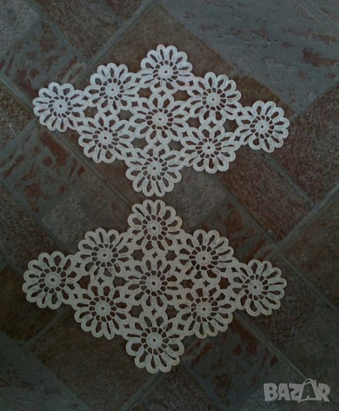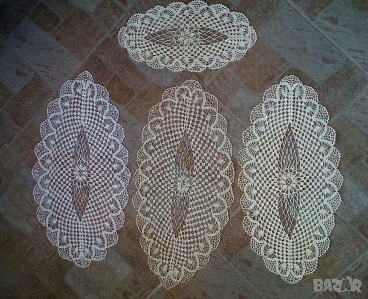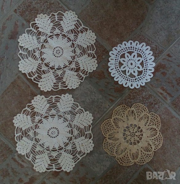 2. Плетена луксозна покривка за квадратна маса на една кука, с размери 130 см/130 см, цвят екрю, цена 100 лв.3.Изплетени с голяма любов, в разцветки - екрю и бяло.Различни форми, кръгли, елипсовидни и други. С по-малки и по-големи форми, с цени в зависимост от големината: от 10 лв ,15 лв, 20лв, 30 лв,40лв. При закупуване на повече от 2 ще има и коментар по цената.