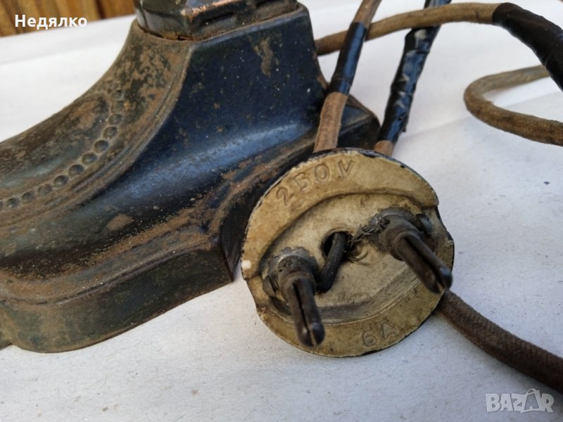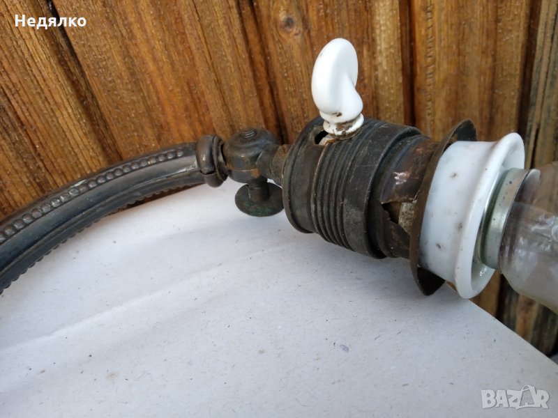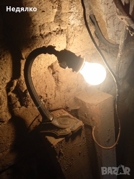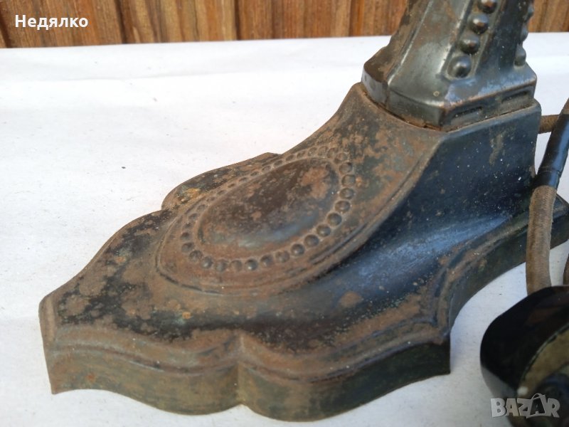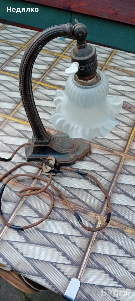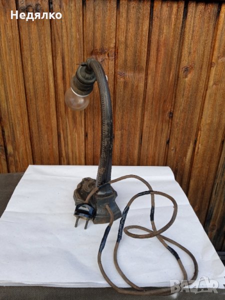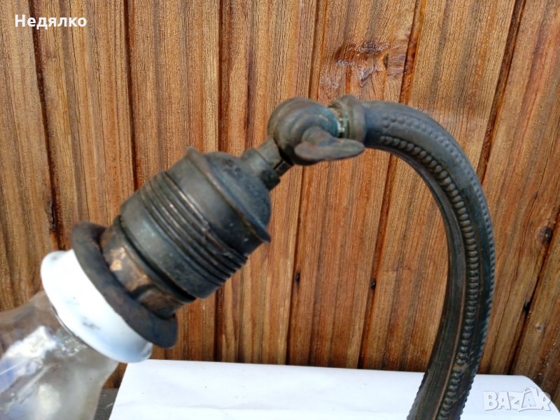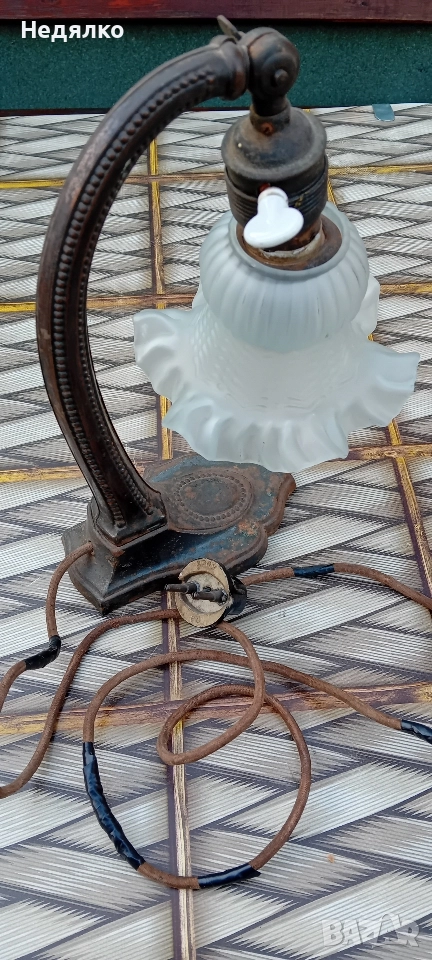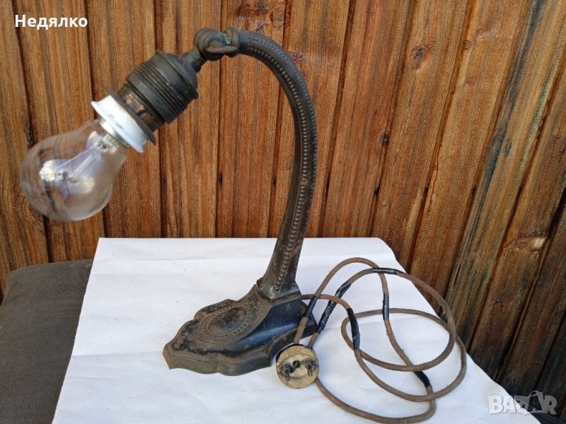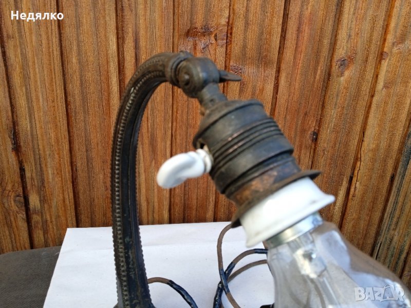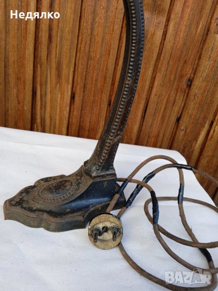 Автентична,тествана,работеща настолна австрийска или немска настолна лампа от около 1900г,маркировки в основата,само и изолирах на места автентичния кабел,защото от времето вече бе прекъснат.Всичко по нея си е автентично,оригинално,с естествената си патина,основата и тялото са от помеднено желязо,не съм го лъскал нарочно,цокли от месинг и керамика- бял порцелан,уникален щепсел от истинска керамика- вечен с покритие от черен емайл,понеже е много старо изделие,тествал съм го в контакт без външна кутия,защото щепсела няма тези канали,за да влезе.Височина 28 см, ширина в най-широка част на основата- 9,3см.Бялото порцеланово копче от страни на месинговия цокъл си работи много добре,стегнато и плавно си включва и изключва лампата!Винта отгоре,над цокъла, си фиксира точно и стегнато лампата, под какъвто ъгъл си пожелаете...На последните 3 снимки е със стъкло, проект за реставрация, давам и него при интерес