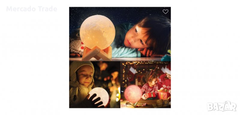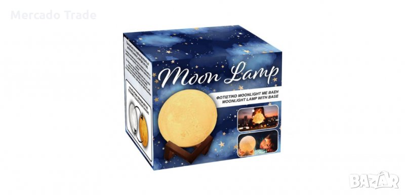 Лунна лампа, която сменя цветовете, с дървена основа.Това е симулация на истинската луна във фаза на пълнолуние, с реалистични сенки, кратери и планини.