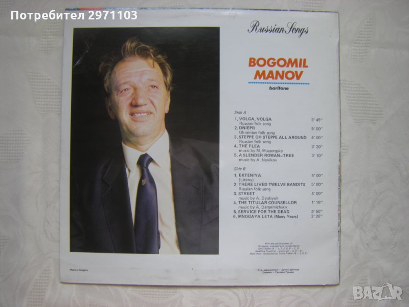 With the participation of Orchestra, arranged and conductor by Emil Kolev (1, 2, 3, 5, 7, 8); Serafima Dyatchin - piano (4, 9); male chor conductor by Toma Pitkov (6, 10, 11)