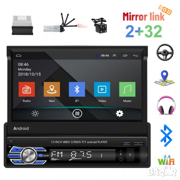 Мултимедия, плеър, с Андроид, 2+64, единичен дин, навигация, за кола, парктроник, автомобил, Android