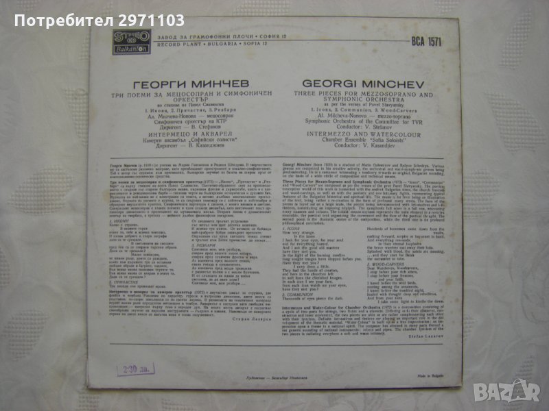 Грамофонна плоча - ВСА 1571 - Георги Минчев - Поеми за мецосопран и симфоничен оркестър
