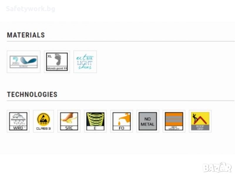 език. Напълно неметална обувка - ESD . Защита на крака с бомбе 200J с размер 11 от полимерен композитен нетермичен материал съгласно EN 12568, защитна гъвкава текстилна стелка от антиперфорационна композитна тъкан съгласно EN 12568.