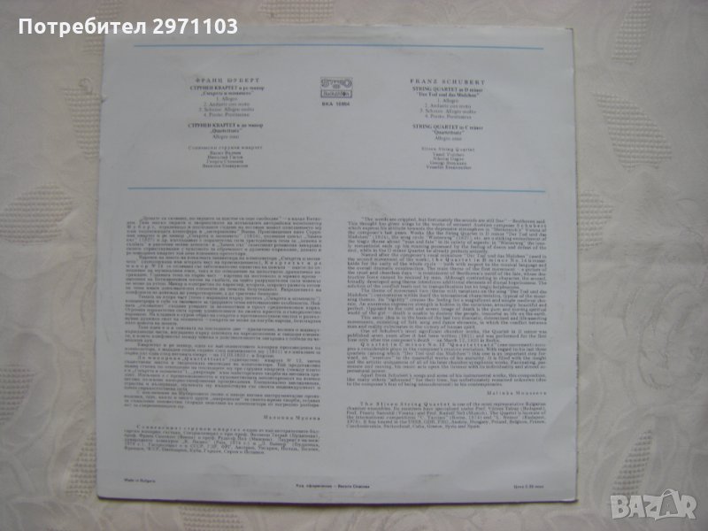 Грамофонна плоча - ВКА 10954 - Франц Шуберт - изп. Сливенски струнен квартет