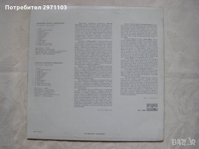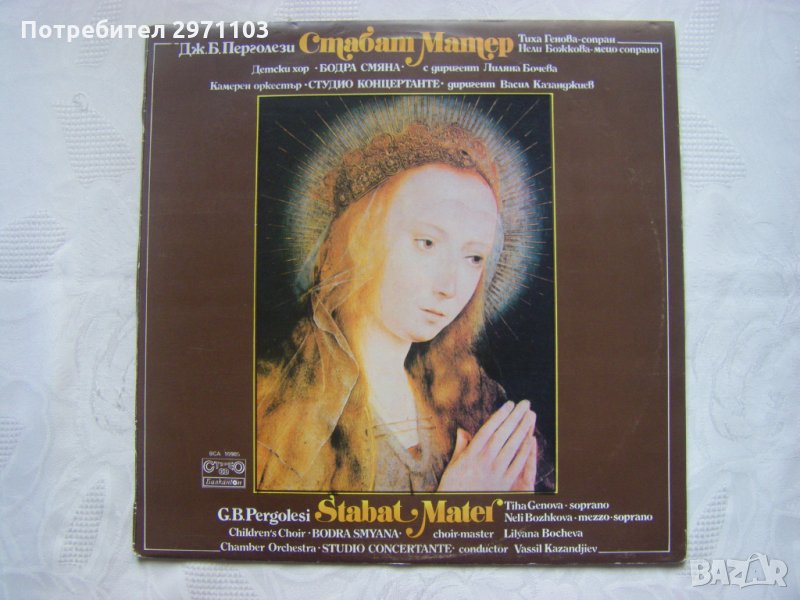 Изпълняват Тиха Генова - сопран и Нели Божкова - мецосопрано с хор "Бодра смяна", диригент Лиляна Бочева и Камерен оркестър "Студио концертанте", диригент Васил Казанджиев