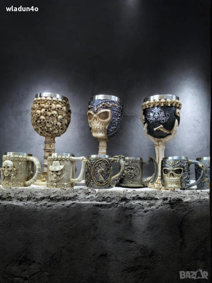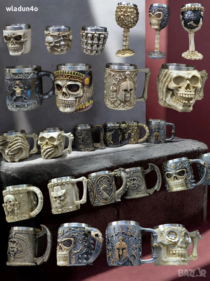 1..Оригинални чаши за питиета във формата на череп-войн .Изработени от специална смола (наподобяваща истинска кост) и чаша от стомана.