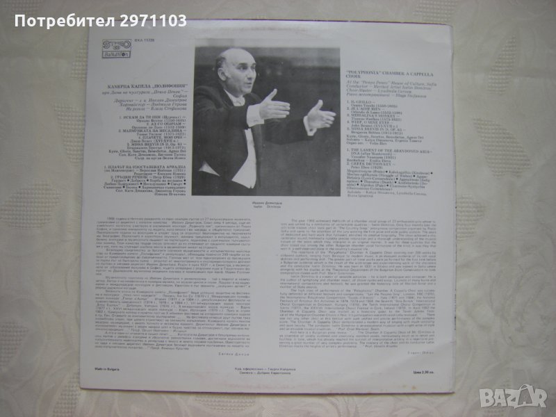 Искам да ти пея / О. Векки. Аз го обичам / О. Ди Ласо. Маймунката на Месалина / Т. Уилкс. Плачете, мои очи / Дж. Бенет. Оп. 63. Missa Brevis in D / Б. Бритън; солисти К. Диманова и Ев. Тасева; съпровожда на орган В. Илиев. Плачът на изоставената Ариадна / по Кл. Монтеверди; обраб. В. Нойман; рецитация Ем. Илиева. Гръцки речник / П. Ебен; солисти К. Диманова, Л. Герова и И. Игнатова