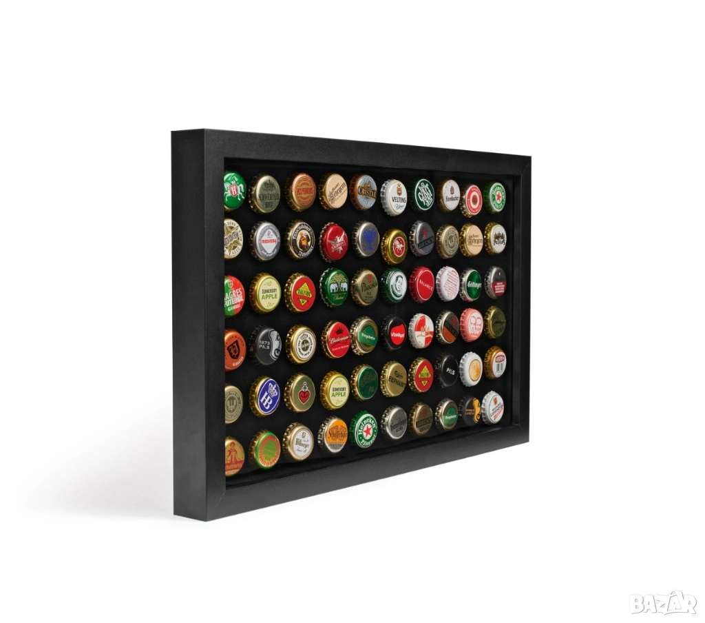 Черни рамки за показване на 60 капачки за шампанско или капачки за бутилки.