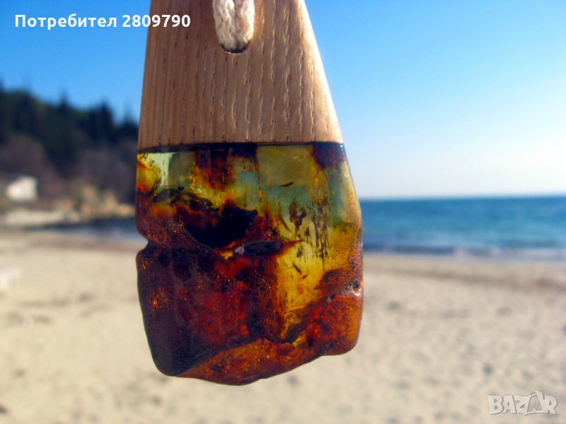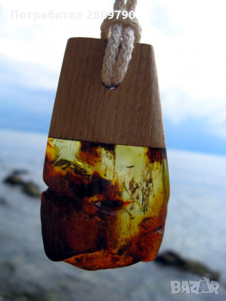 Красива, естествено оформена висулка с оригинална форма, изработена от балтийски естествен кехлибар и дърво. Голям, прозрачен меден кехлибар, примесен с праисторически живот, който е съществувал на Земята преди 50 милиона години. Черноморската раковина допълва висулката и позволява на Балтийско и Черно море да се срещнат. Той служи и като закопчалка, с която можете да променяте дължината на шнура, на който виси висулката.