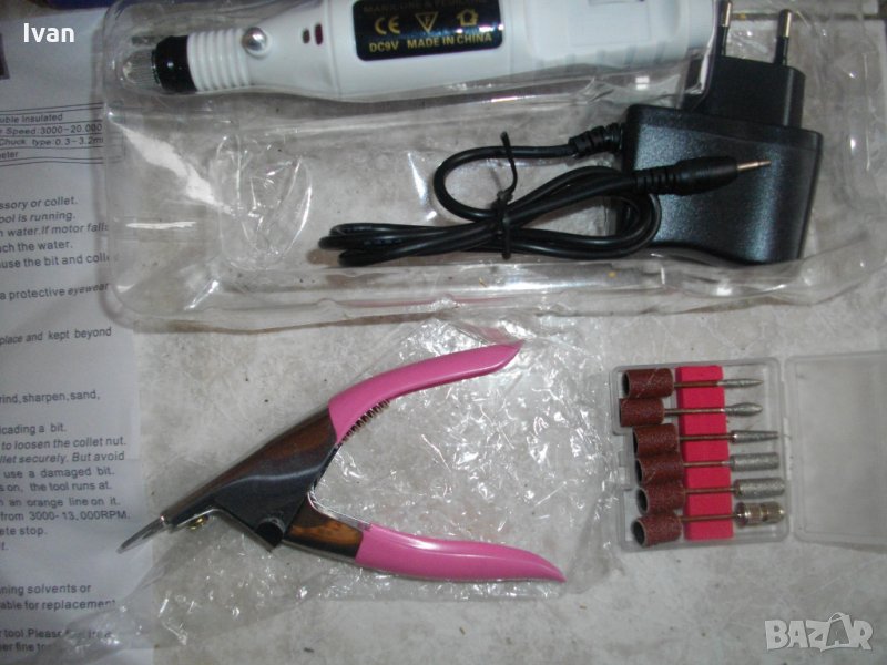 Комплекта включва електрическа пила - мини дрелка шлифовалка, работеща на 220 волта чрез адаптер 9 волта, включен в комплекта. Общо 12 броя накрайници аксесоари за шлайфане на всякакви повърхности. Към комплекта има и ножица за ноктопластика - гилотина за рязане и оформяне на полусфера на изкуствени нокти. Ножицата е от неръждаема стомана.