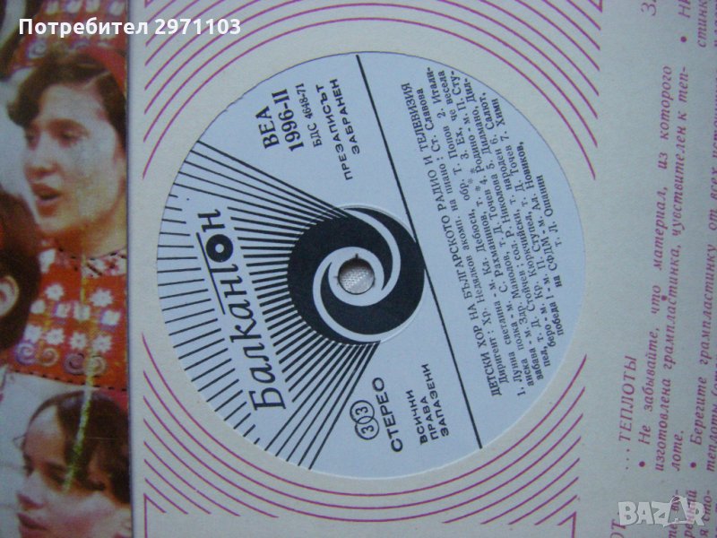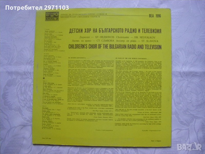 Зимна песничка / Хр. Недялков; текст Д. Спасов. Весела гама / З. Манолов; текст Л. Станчев. Държава Пионерия: 1 и 2 част / П. Ступел; текст Г. Авгарски. Росица роси: текст народен / Д. Петков. Пиленце пее: текст народен / Кр. Кюркчийски. Едно море край нас синее / Г. Костов; текст Д. Попова. Хубава си, татковино / Ем. Манолов; текст П. Р. Славейков. Лунна светлина / Кл. Дебюси; обработил Т. Попов. Италианска полка / С. Рахманинов. Ех, че весела забава / З. Манолов. Родина / П. Ступел; текст Д. Стойчев.; солистка Р. Николова. Дилмано, Дилберо: текст народен / Кр. Кюркчийски. Салют, победа! / П. Ступел; текст Д. Точев. Химн на СФДМ / Ан. Новиков; текст Л. Ошанин