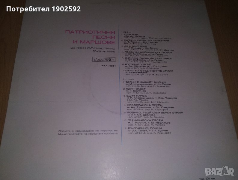 Патриотични песни и маршове за военно-патриотично възпитание ВХА 10254, снимка 1 - Грамофонни плочи - 35265609 Патриотични песни и маршове за военно-патриотично възпитание ВХА 10254, снимка 2 - Грамофонни плочи - 35265609 1/2