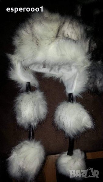 Шапките са ефектни и топли, с дълъг еко-косъм. Има синя, кафява, сива.