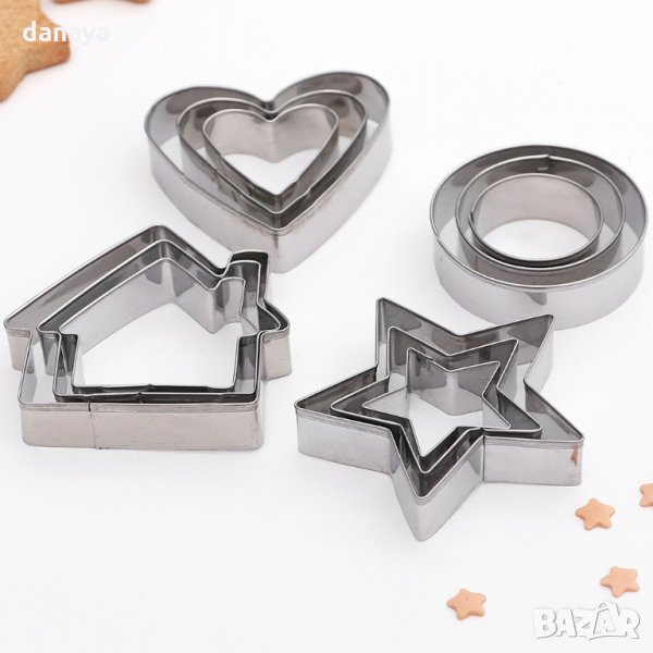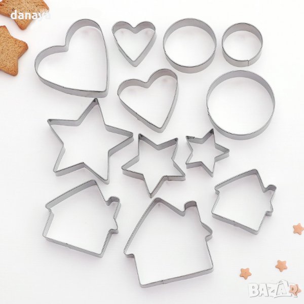 Комплект от 12 броя метални форми за сладки. Метални резци с форма на къщичка, сърце, зевда, кръг, с различни размери. Идеални за приготвяне на домашни дребни сладки, бисквити, курабийки, меденки, за украса на ястия, салати и други. Комплектът включва по 3 размера от всеки модел.