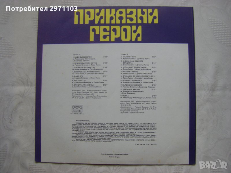 Аранжимент на песните Александър Александров, Евгени Платов и Гавраил Витанов; изпълнява Детска вокална група "Алени пламъчета" и артистите Вера Среброва, Рени Зарева, Иван Балсамаджиев и Емил Джамджиев.; съпровожда оркестър, диригент Гавраил Витанов