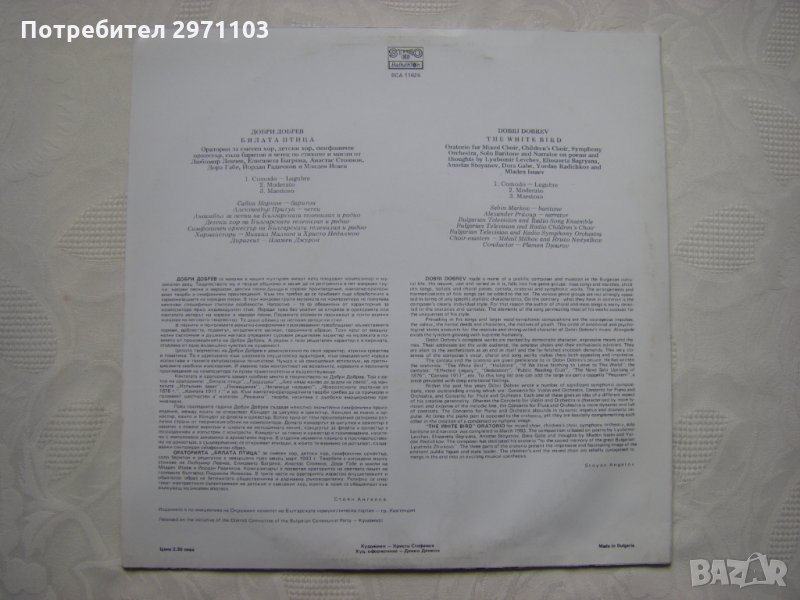 Грамофонна плоча - ВСА 11626 - Добри Добрев. Бялата птица: оратория: за смесен хор, детски хор, симфоничен оркестър, соло баритон, четец на стихове и мисли от Любомир Левчев, Елисавета Багряна, Анастас Стоянов, Дора Габе, Йордан Радичков и Младен Исаев
