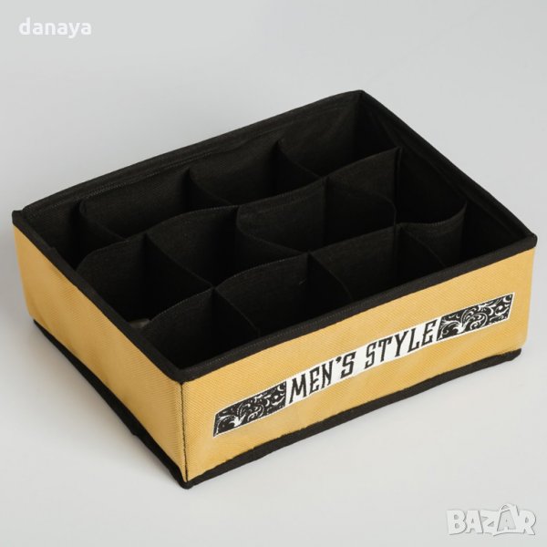 Малък текстилен органайзер за чекмедже, специално създаден за организирани и модерни съвременни мъже. Органайзер за чекмедже, практичен и удобен. Сгъваема кутия за съхранение на чорапи, бельо и други дребни аксесоари. Текстилен органайзер за гардероб, чекмедже, шкаф. Органайзерът е сгъваем и лесно преносим, което го прави подходящ и за пътуване. 12 отделения. Изработен от нетъкан текстил, подсилен с картон.