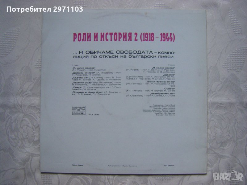 Грамофонна плоча - ВАА 10780 - Роли и история 2 (1918-1944). "И обичаме свободата". Композиция по откъси из бълг. пиеси