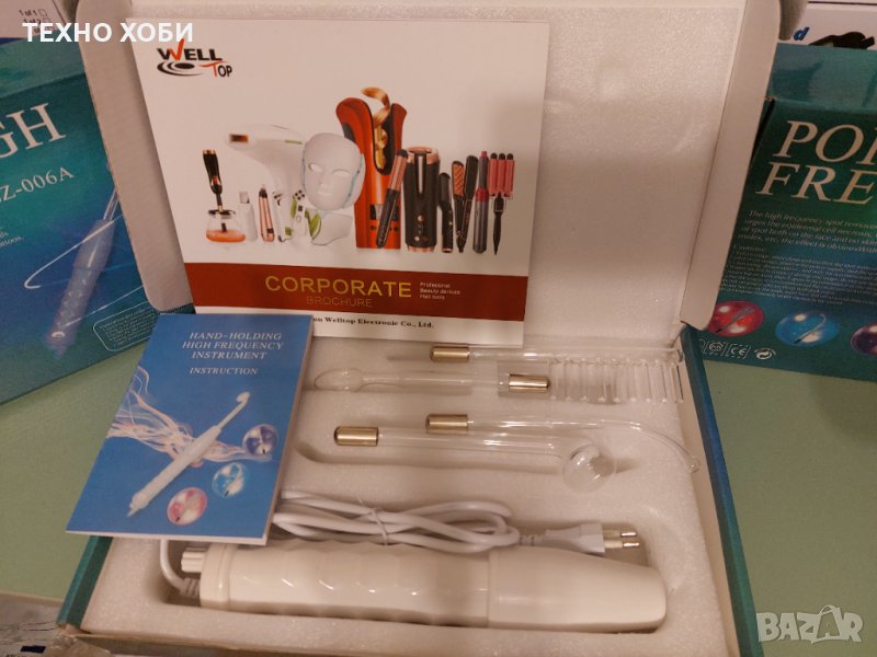 Устройството е оборудвано и с 4 стъклени електрода, които могат да бъдат избрани в зависимост от повърхността на кожата, която се третира.