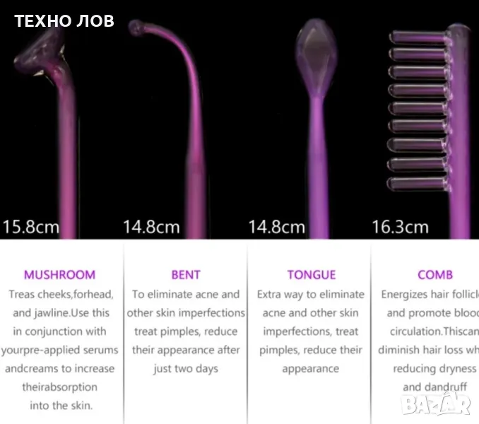 електрод с пръчка (пръчка) за третиране на отделни участъци.електрод с форма на гъба (гъба) подходящ за третиране на цялото лице.електрод с форма на капка (чаена лъжичка) за по-трудно достижими повърхности, например кухини около носа,гребен електрод за съживяване на скалпа, стимулира растежа на косата, предотвратява загубата на коса.10w мощност