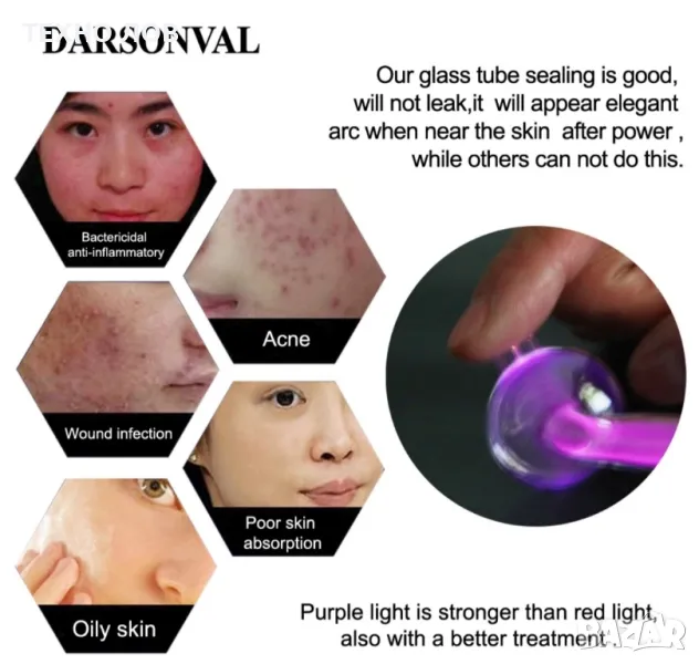 Високочестотните токове наричани Darsonval в козметиката се използват за стимулиране на метаболизма, засилване на притока на кръв в кожата, причинявайки локална хиперемия, но преди всичко те имат повърхностен дезинфектиращ и антисептичен ефект. Darsonval е устройство, свързано директно към електрическата мрежа. Устройството е изключително удобно и компактно, дръжката има вграден превключвател за включване / изключване, който едновременно регулира тока.