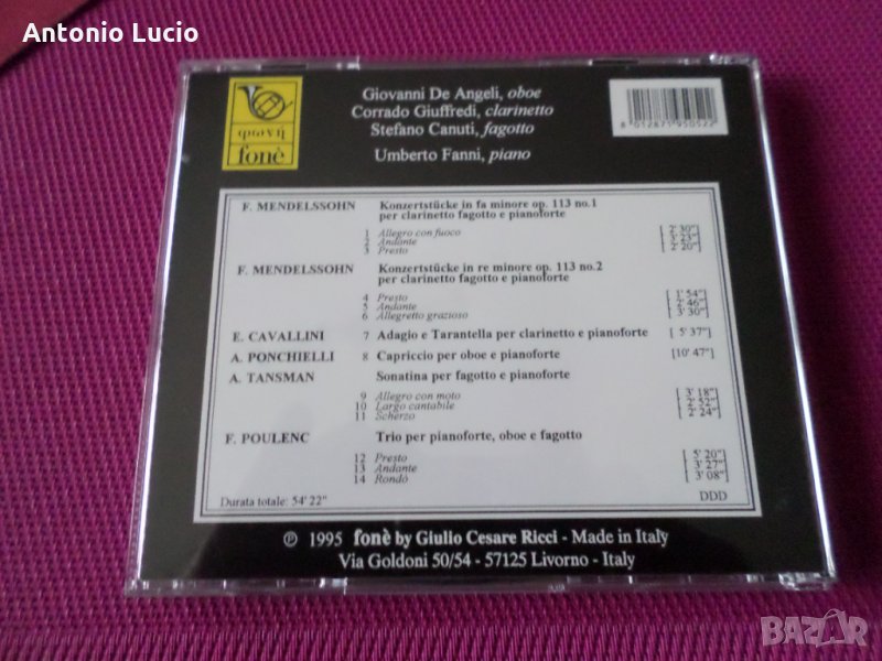 Fone 95F 05 CD .Made in Italy 1995. Рядък , ранен запис от каталога на Giulio Cesare Ricci . Възможна замяна за друг диск Fone , по мой избор. Изпращам с Еконт или Спиди по Ваш избор.