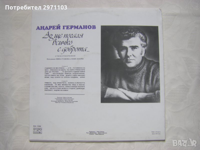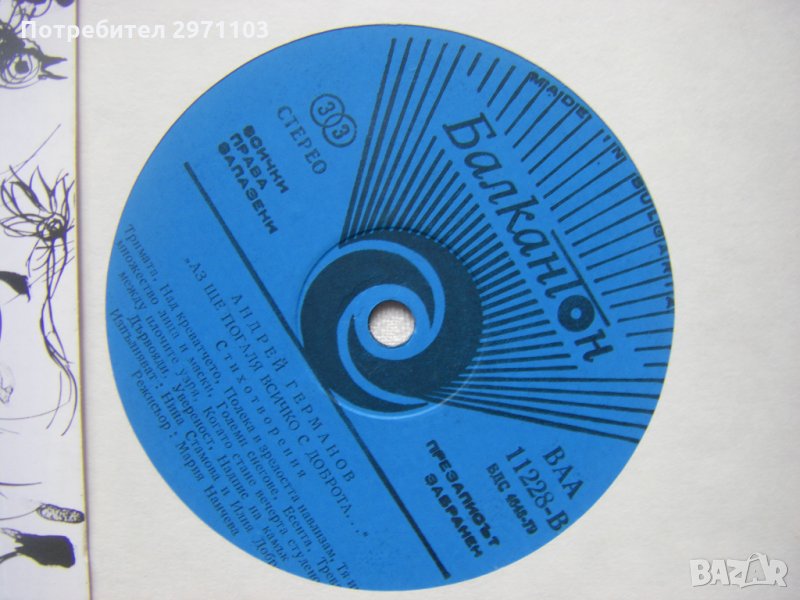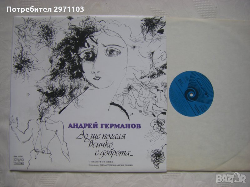 Грамофонна плоча - ВАА 11228 - Андрей Германов. Аз ще погаля всичко с доброта…. Стихотворения. Изпълняват Нина Стамова и Илия Добрев