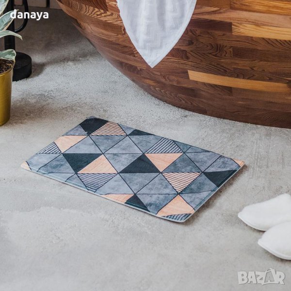 Мека постелка за баня с много свеж и красив геометричен принт. Чудесен декор за дома. С мека, приятна на допир горна част и с антиплъзгаща се долна част.