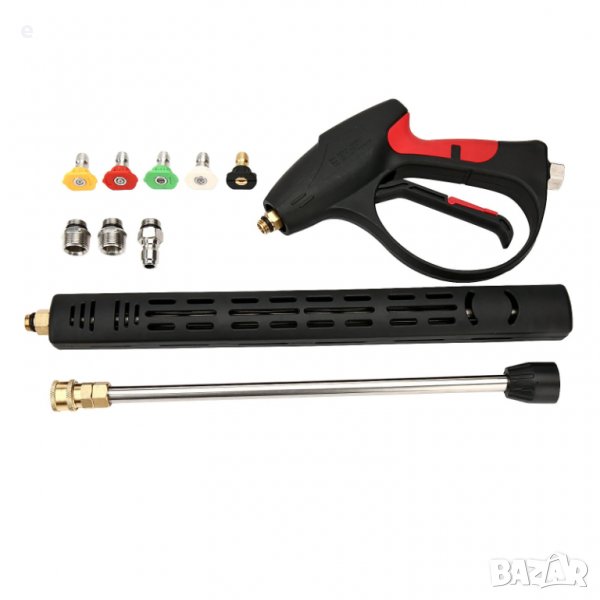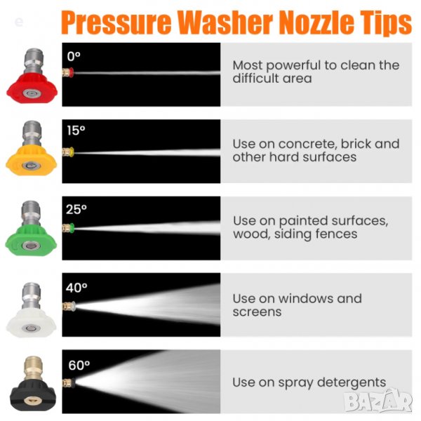- 1/4" бърза връзка за удобно използване. 5 различни ъглови накрайника (дюзи) за миене под налягане за повече ситуации. Перфектен дизайн за почистване на автомобили, прозорци, алеи, покриви, огради, миене на сайдинг, плувен басейн и др.
