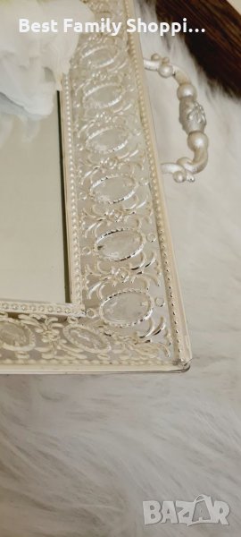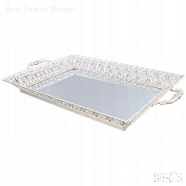 Красива сребриста табла с ажурен ръб. Дъното на таблата е огледало, което много ефектно отразява ръбовете на таблата, наподобяващи сложно изработени ажурни форми.