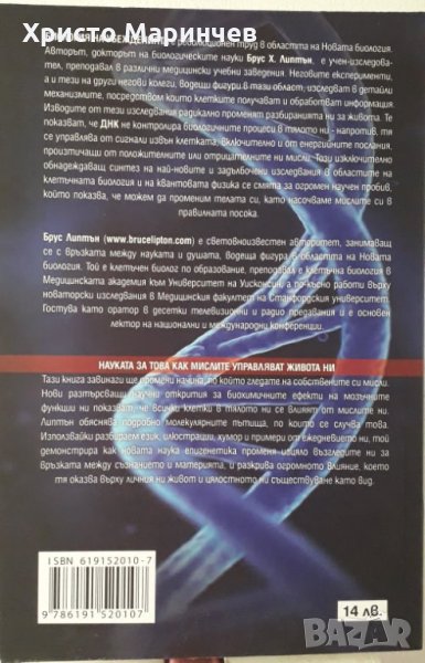 Тази книга завинаги ще промени начина, по който гледате на собствените си мисли. Нови разтърсващи научни открития за биохимичните ефекти на мозъчните функции ни показват, че всички клетки в тялото ни се влияят от мислите ни. Липтън обяснява подробно молекулярните пътища, по които се случва това. Използвайки разбираем език, илюстрации, хумор и примери от ежедневието ни, той демонстрира как новата наука епигенетика променя изцяло възгледите ни за връзката между съзнанието и материята, и разкрива огромното влияние, което тя оказва върху личния ни живот и цялостното ни съществуване като вид.