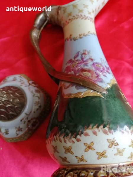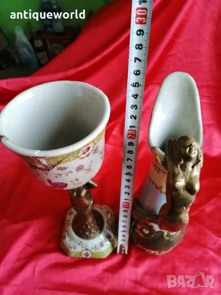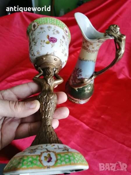 Уникални Красиви Много Редки Стари Съдове ,Кана и Чаша от Порцелан и Бронз Ръчна Изработка и Рисувани.Внимание с реставрация са ,видна от снимките!Маркирани!