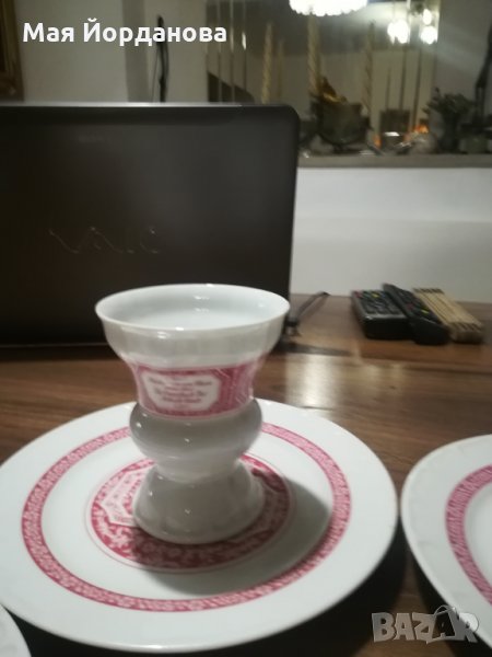 5 старинни, рисувани порцеланови чинии- 22 см. диаметър и две чаши в същия стил от 60-70 те години на миналия век -в перфектно състояние, без пукнатини и нараняване на ръбовете на известната немска фирма за порцеланови изделия Хайнрих-Порцелан. Цената и на чиниите, и на чашите е 6,00 лв. на брой.