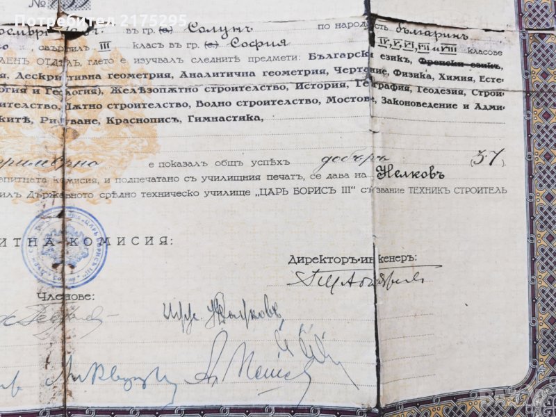 Свидетелство за зрелост от държавно средно техническо училище -гр. София-1932г. - състояние -прокъсано