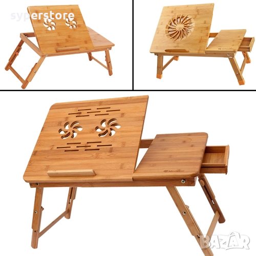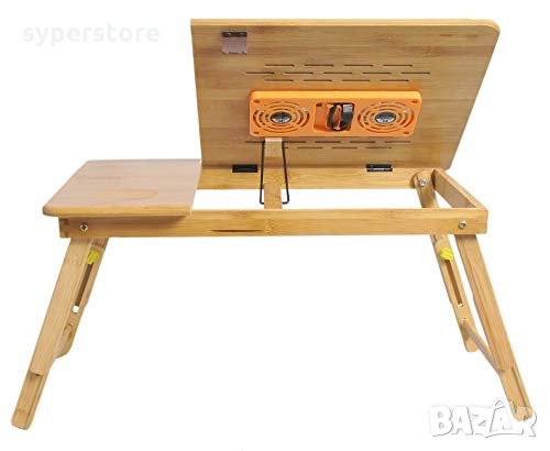 Бамбуковата масичка за лаптоп, може да се използва като мини бюро за четене, поднос за закуска, маса за оцветяване, работно мини бюро в леглото, на пода, на дивана, в креслото, в кола и при пътуване.Тази масичка е чудесен избор за тези, които обичат да закусват в леглото. Тя ще повдигне устройството ви до нивото на очите и ще ви помогне да работите комфортно, спестявайки ви болки във врата или гърба. Накланяща се, сгъваема, стабилна, много качествена и лесна за съхранение. Нейната елегентна изработка, ви осигурява уют и комфорт. С преграда в долната часта на масичката се предотвратява плъзване на лаптопа ви, когато плота е наклонен надолу. Може да регулирате наклона, под 5 различни ъгъла. Снабдена е с два тихи вентилатора за по-добро разсейване на топлината.Тежи само 2.5 кг и се сгъва лесно, така че да вземете това удобство навсякъде, къдете би ви било необходимо мини бюро.