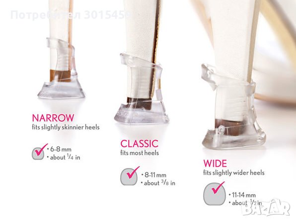 Продуктът приляга плътно към токчето на обувките ви, без да ги повредите поради меката горна зона, като в същото време се поддържа от по-твърда долна зона, за да се справите със суровите повърхности и да осигурите по-голяма повърхност на токчетата си (това също така ще ви попречи да потънете в пропуските в настилка или в тревата на градинско парти много по-лесно ходите на токчета).