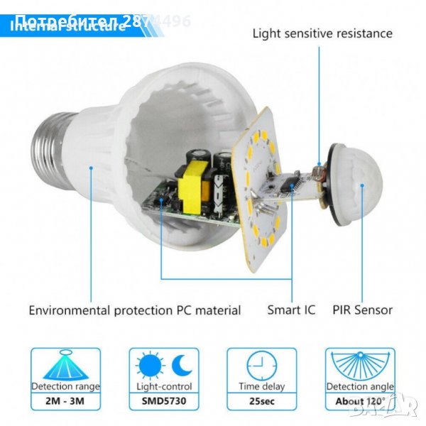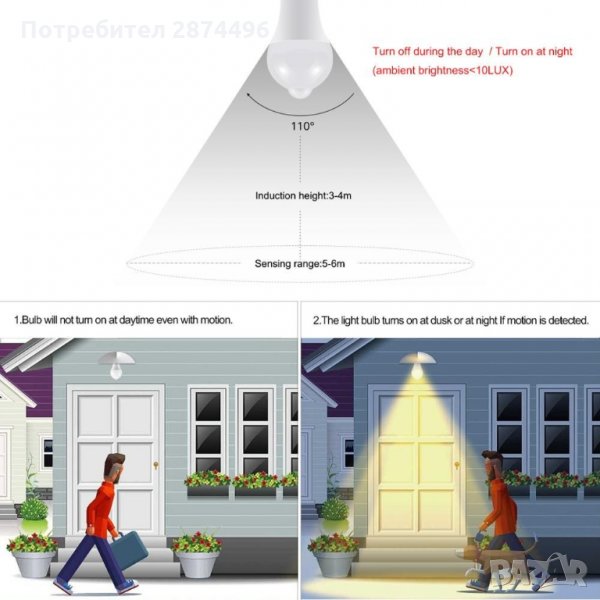 Сензорна крушка с мощност 9W еквивалент на класическа нажежаема лампа от 60W. Тя има интегриран сензор за осветеност, който и позволява да работи в тъмната част на денонощието.