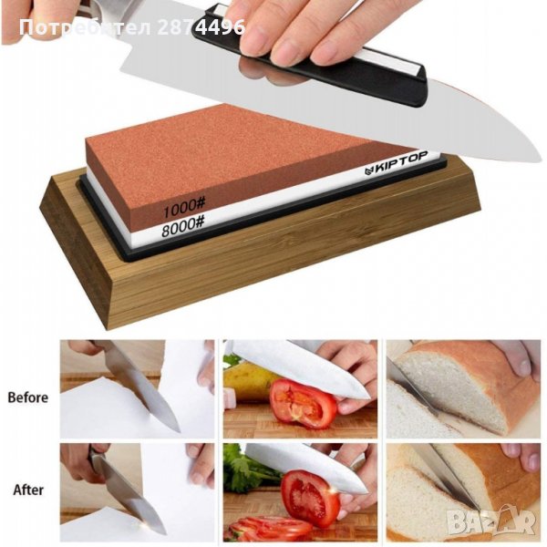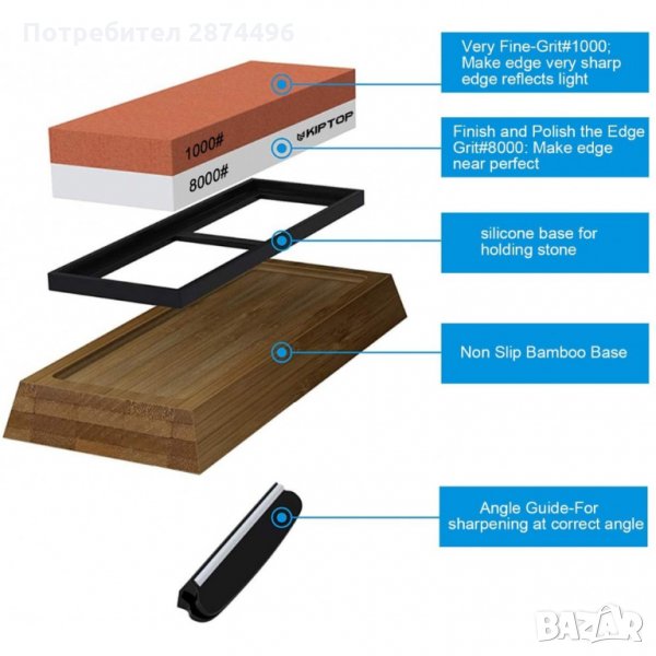 Комплект камъни (японски брус) за заточване на ножове с два различни вида плочки, всяка с различен грит. Подходящи за фино или основно точене на различни видове остриета. Към комплекта получавате и силиконова основа против хлъзгане и по-удобна работа, дървена стойка, както и водач за ъгъла при заточване с камъка.