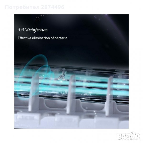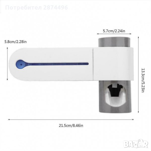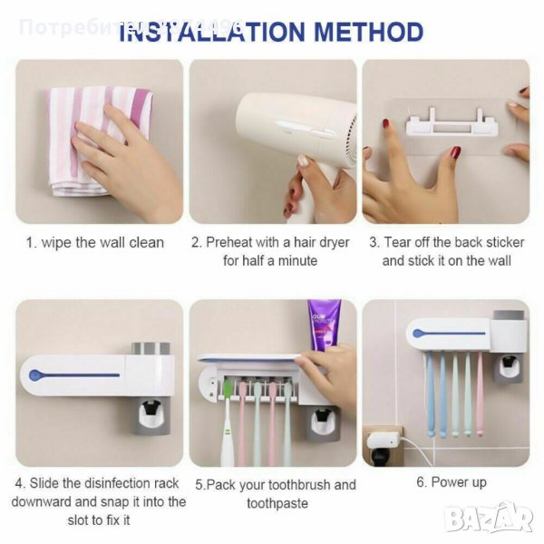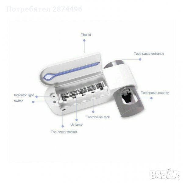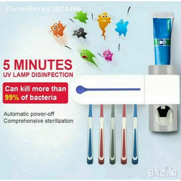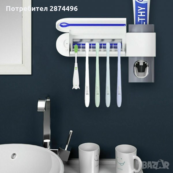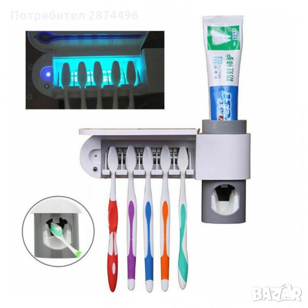 Пълен и ефективен многофункционален 3-в-1 UV стерилизатор за четки за зъби, с дозатор за паста за зъби и поставка, която се закрепва към стената чрез лепяща фиксация. Този семеен държач за четки за зъби побира 5 четки за зъби, още повече е подвижен за лесно почистване. Идеален за постигане на по-удобно и безопасно четкане, предпазвайки четките от бактериално замърсяване чрез ултравиолетова светлина, която ги дезинфекцира бързо и лесно, като елиминира бактериите и микроорганизмите за няколко минути.