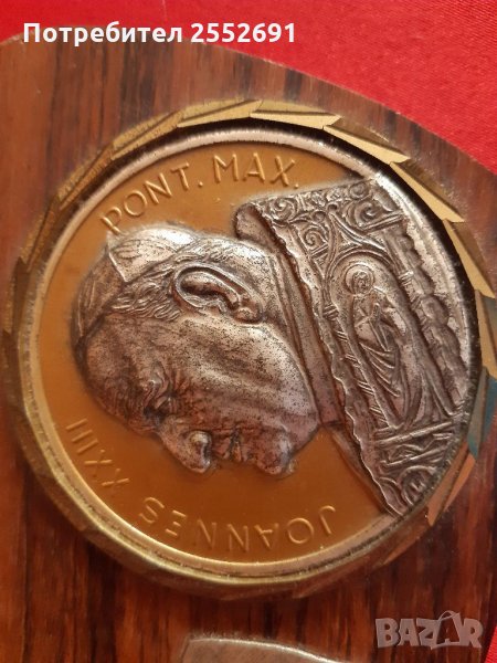 Религиозен метален сувенир на дървена основа. Размери- 14/9/1см.