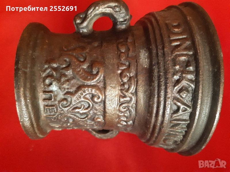 Масивен метален съд- хаван с надписи и инкрустации. Височина-9см. Без чукало.